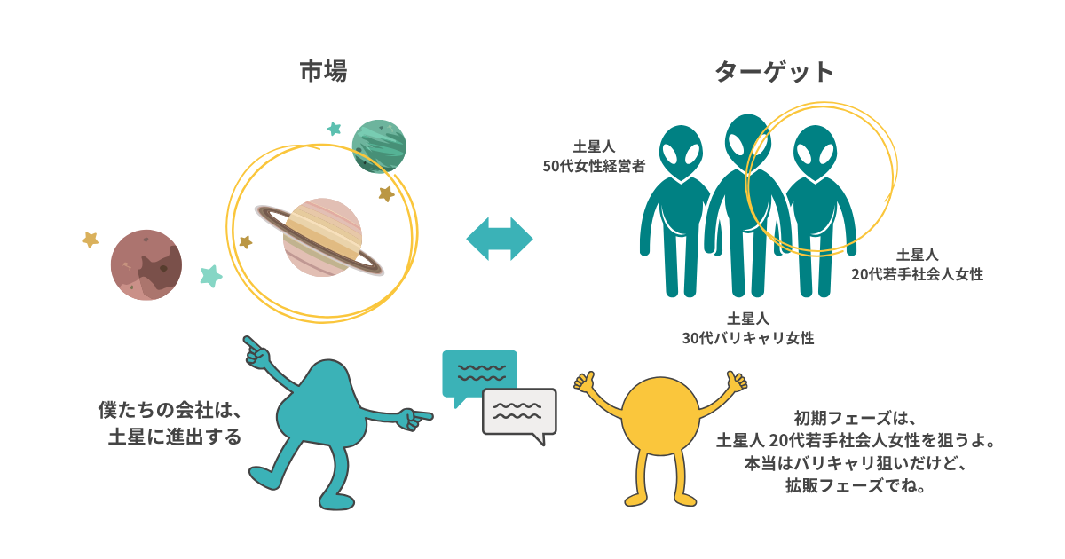 Marketing なぜターゲットがぶれる?失敗しないマーケティングターゲット設定方法 美緒香山川 2025年11月14日 Share: Facebook X マーケティング担当者として、「まずはペルソナを設定しよう」としたものの、うまく進まなかった経験はありませんか?せっかく丁寧にペルソナを作っても、チーム内や経営陣、他事業部にうまく浸透せず、気づけば“設定しただけ”で終わってしまう——。 そんな状況に心当たりがある方も多いのではないでしょうか。 まず、お伝えしたいのは、ペルソナが決まらないときに、無理に設定する必要はないということです。 ペルソナは、マーケティング施策を考えるためのツールであり、「誰にどんな価値を届けるのか」という事業ターゲットを具体化する手段です。つまり、細部を詰める前に“軸となる前提”を整理しておくことが大切です。また、ペルソナは複数あって構いません。事業フェーズや顧客層によって複数設定し、状況に応じて使い分けるのが自然です。 では、なぜペルソナが決まらないのか。その多くは、ペルソナ設定の前に決めておくべきことが抜けているケースです。 ペルソナを含むマーケティング設計を始める前に、明確にしておくべきポイントは次の二つです。 >> 『マーケティング戦略が進まない人必見!フレームワークをやる前に絶対に決めるべき「アイデンティティ」とは?』 本記事では、アイデンティティが定まった後の「ターゲット設定」について、経営陣・各事業部・マーケティング担当が共通認識を持つための考え方と、実践のコツを解説していきます。 目次 ・マーケティングにおけるターゲットとは? ▹ なぜターゲットを明確にする必要があるのか ▹ ターゲットを定義するとは、「軸を持つ」こと ・事業ターゲットはマーケティングターゲットと目線を合わせるべき ▹ アイデンティティが両者をつなぐ“共通言語”になる ・ターゲット/ペルソナ/市場の違い ▹ 市場 = 事業の大きな舞台 ▹ ターゲット = その市場の中で価値を届けたい層 ▹ ペルソナ = ターゲットを“ひとりの人”として描くツール ・なぜマーケティングのペルソナ設定でつまずくのか ▹ 前提のターゲットが定まっていない ▹ チームや経営層との認識がずれている ▹ ペルソナ設定を“目的”にしてしまっている ・事業フェーズごとのターゲット設定 ▹ 中長期のゴールを見据えてターゲットを設計する ・マーケティングターゲット設定の具体例 ▹ パターン1:想いで共感を広げ、のちに“商品”で信頼を築き、“ブランド”で定着させていくモデル ▹ パターン2:ニーズの広いサービスを、段階的にフォーカスを変え展開するモデル ▹ パターン3:SaaS - ニッチから始め、実績で信頼を積み上げ、メインストリームへ拡大するモデル ・まとめ マーケティングにおけるターゲットとは? マーケティングにおける「ターゲット」とは、自社の価値を最も必要としてくれる人たちのことを指します。もっとやわらかく言えば、事業の想いを、ちゃんと受け取ってくれる相手です。 前の章で決めた「アイデンティティ」では、“どんな人たちに、どんな価値を届けたいか”を明確にしました。ターゲット設定とは、その中でも実際にその価値を受け取ってくれる人たちは誰なのかを見極める段階です。 たとえば、「忙しく働く女性を支える存在になる」というアイデンティティを掲げたとします。 その中でも、今すぐ共感し、行動を起こしてくれそうなのは—— 忙しい中でも自分らしさを大切にしたいと考える20代後半の女性かもしれない そうやって“まず最初に届く人”を見つけていくのが、ターゲット設定の出発点です。 複数の意見が出てきても大丈夫です。最初から一つに絞り込む必要はありません。 まずは候補を並べてみて、どんな人たちが自社の価値を受け取ってくれそうかを整理してみましょう。どのターゲットを最優先で強化するかは、事業フェーズごとの段階で考えるものなので、このあとであらためて整理していきます。 なぜターゲットを明確にする必要があるのか ターゲットを明確にする目的は、事業やサービスの“軸”を守るためです。 フェーズごとにターゲットを設定していく中で、多くのチームが陥りやすいのが、それぞれが“自分の思う理想顧客”を勝手に描いてしまうこと。 マーケは「SNSで話題になりそうな層」、開発は「使いやすさを求める層」、営業は「すぐ契約してくれる層」……。それぞれの視点で正しいのですが、結果としてサービスにいろいろな要素が入りすぎて、「誰にとっても便利だけど、誰の心にも響かない」ものになってしまいます。 「誰にとっても便利」に至るには、当然コストも時間もかかります。リソースが限られている中で中途半端に多要素を詰め込むと、競合があたり前に提供している機能や品質にまで手が回らず、“顧客が本当に求めている価値”を満たせなくなることがあります。その結果、「今、自分が欲しいものではない」と感じられ