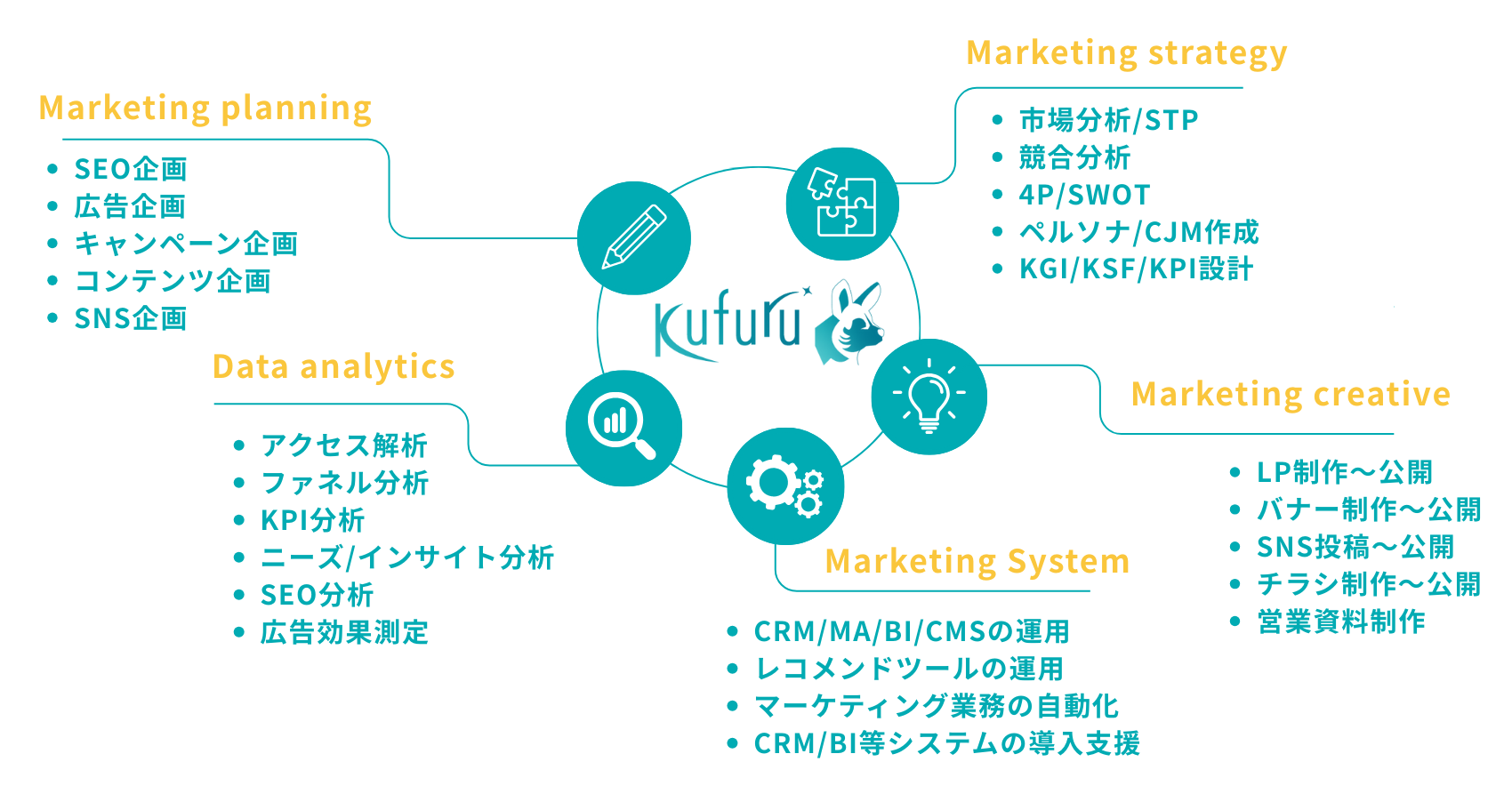 News マーケティングサービスをリリースいたしました kufuru_marketing 2025年9月5日 Share: Facebook X この度、株式会社Kufuruはデジタルマーケティングサービスをリリースいたしました。お客様の多様なニーズにお応えするため、「完全請負型マーケティングサービス Order Mark(オーダーマーク)」と「月額コンサルティングサービス Consult Mark(コンサルトマーク)」の2つのサービスを提供いたします。 完全請負型マーケティングサービス:Order Mark (オーダーマーク) 「Order Mark」は、お客様のご要望に応じたアウトプットをKufuruが完全に請け負うマーケティングサービスです。SEO企画、広告企画、キャンペーン企画、コンテンツ企画、SNS企画といったマーケティングプランニングから、市場分析、競合分析、ペルソナ/CJM作成などのマーケティング戦略の立案、LP制作、バナー制作、SNS投稿などのマーケティングクリエイティブ、さらにはアクセス解析、ファネル分析、KPI分析といったデータアナリティクスまで、幅広い領域で対応可能です。お客様は具体的な成果物をKufuruに依頼することで、効率的かつ確実にマーケティング目標を達成できます。 月額コンサルティングサービス:Consult Mark (コンサルトマーク) 「Consult Mark」は、デジタルマーケティングのスペシャリストが月次のマーケティングの成果を計測し、PDCAサイクルの支援を行う月額制のコンサルティングサービスです。デジタルマーケティングの戦略、企画、分析の担当者が欲しい方に最適なサービスです。 Premium:月額60万円 月次データ分析レポーティング(クライアント提出レベル)、定例mtgの出席、週2日のサポート対応、進行管理業務、企画案・戦略案の提出を行います。 Standard:月額30万円 月次データ分析レポーティング(上申レベル)、定例mtgの出席、週1日のサポート対応、企画案の提出を行います。 Light:月額15万円 月次データ分析レポーティング(現場レベル)、定例mtgの出席を行います。 株式会社Kufuruは、お客様のデジタルマーケティングを強力にサポートし、事業成長に貢献してまいります。詳細については、サービス紹介資料をダウンロードください。
